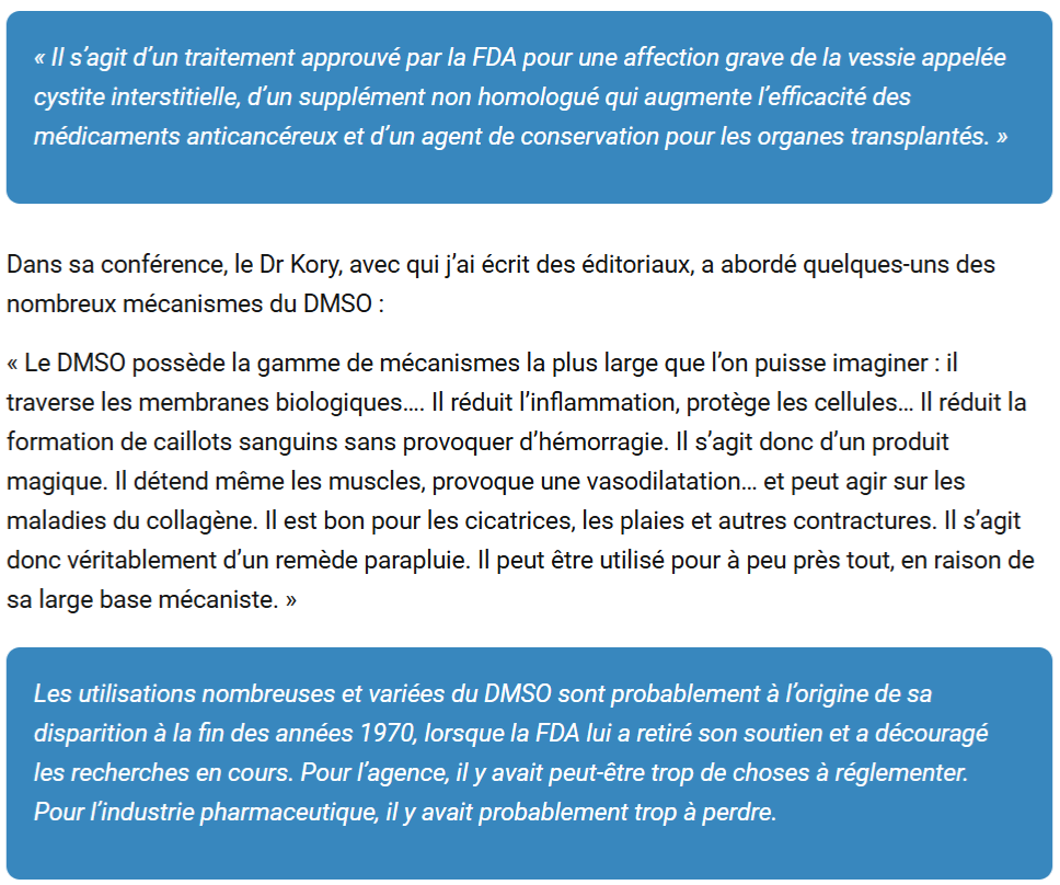 Nous ne résistons pas au plaisir de vous présenter en exclusivité mondiale les premières paroles prononcées en Français par le Pr Pierre Kory lors du Xe congrès de l’AIMSIB (Association Internationale pour une Médecine Scientifique, Indépendante et Bienveillante) autour de l’utilisation d’un produit exceptionnel donc vilipendé et négligé, le DMSO.